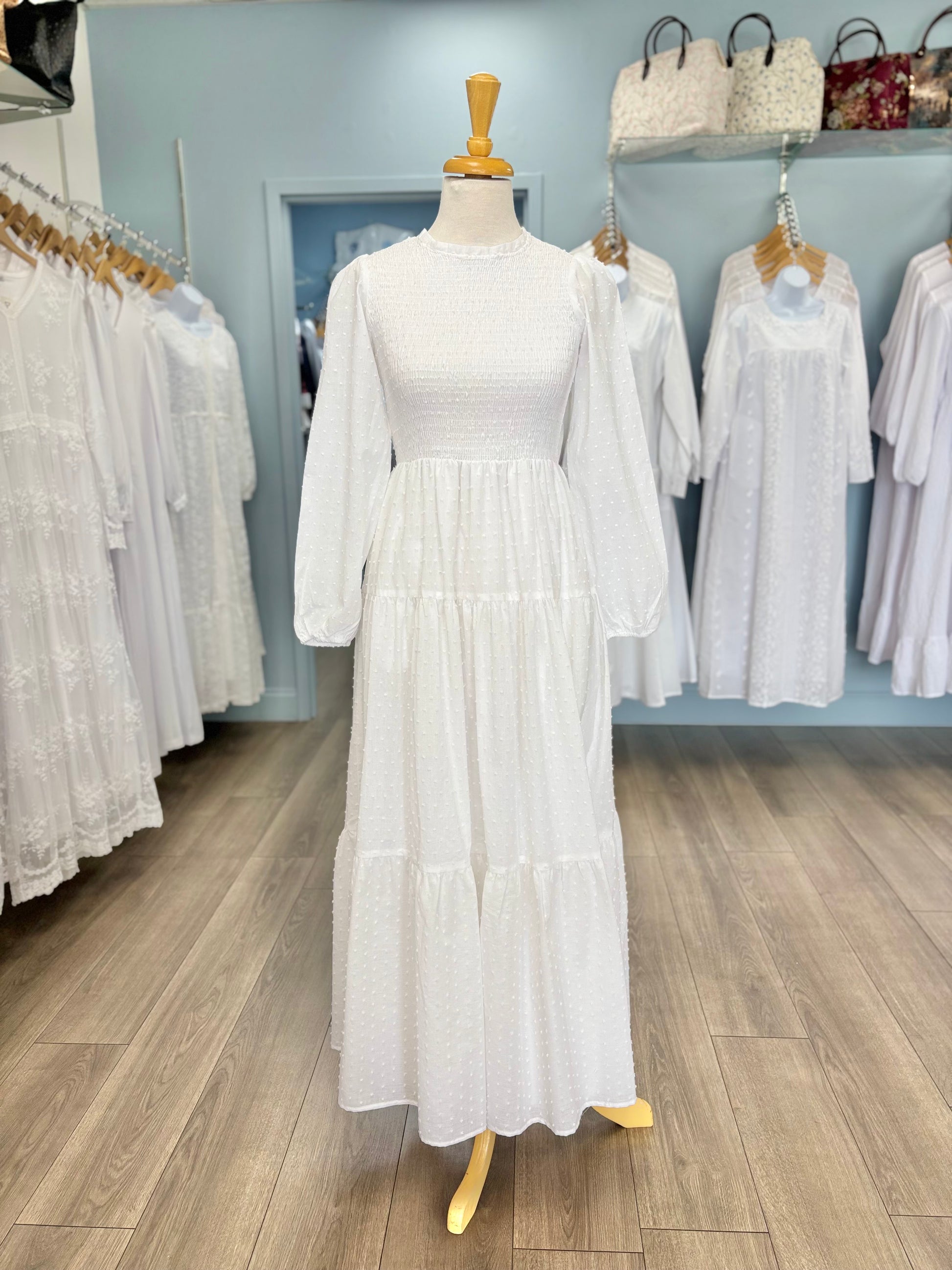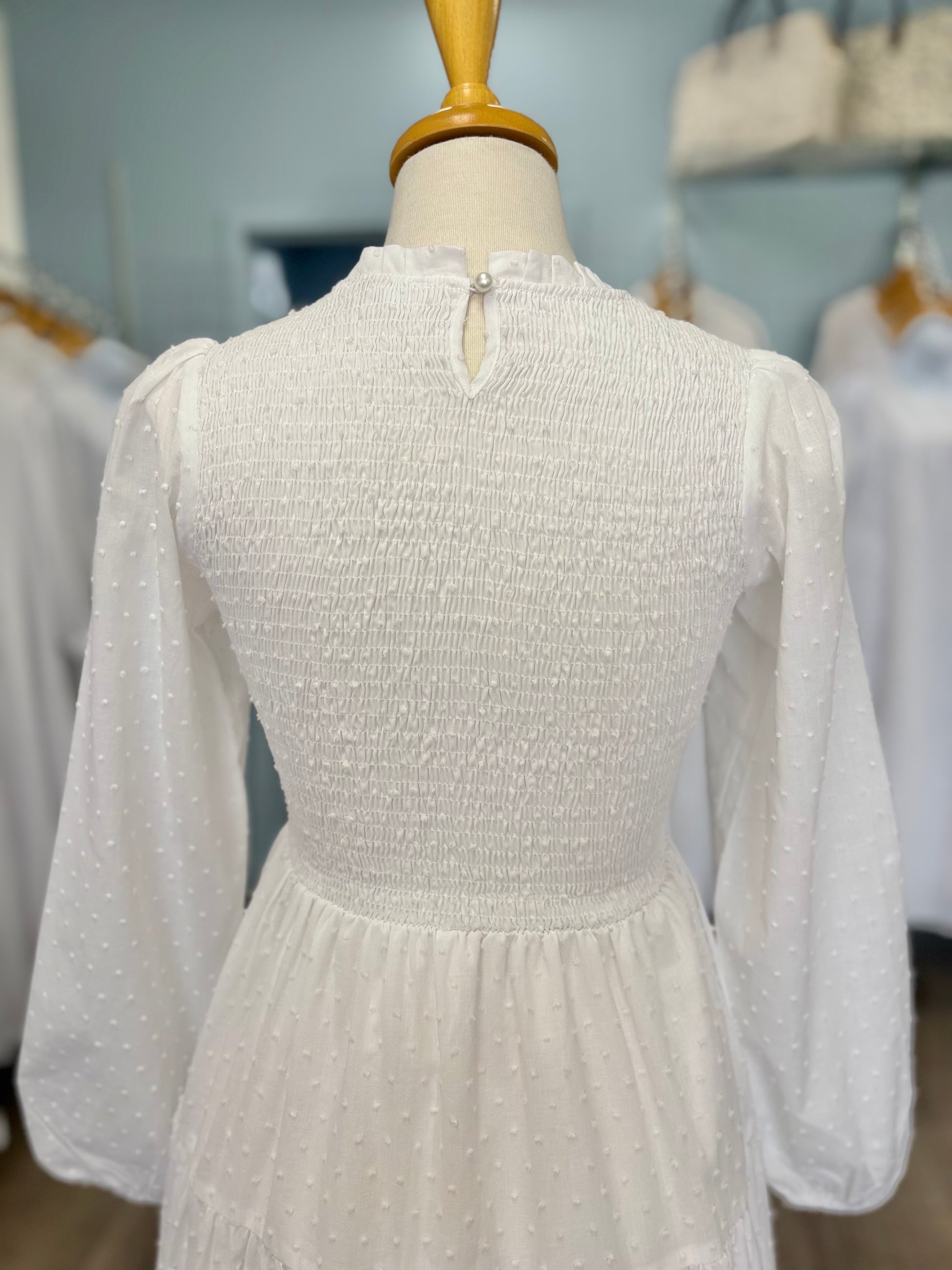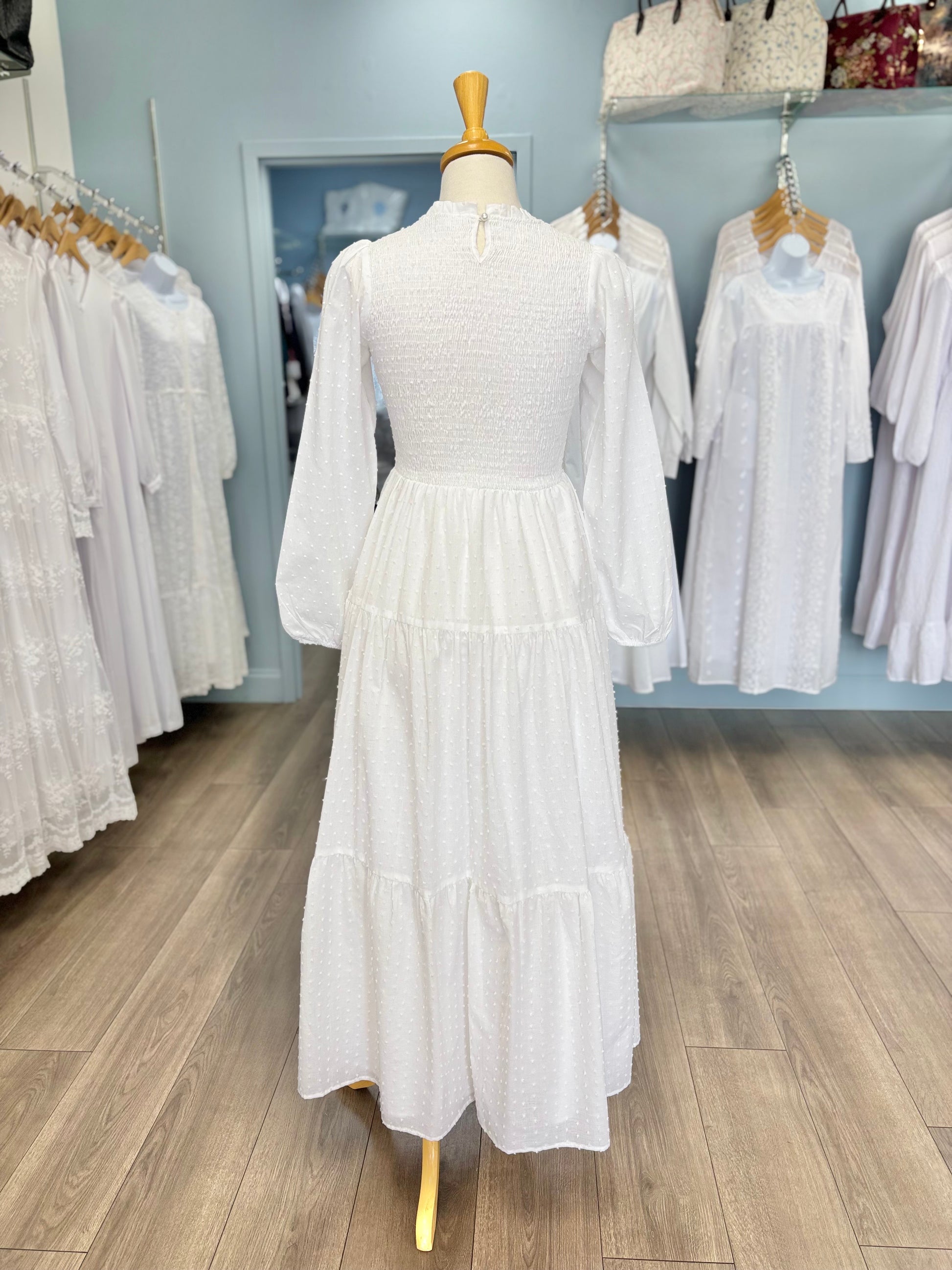 The Catherine dress is made from soft and breathable cotton. It has an all over Swiss dot pattern, a tiered skirt, bishop sleeves, and a smocked bodice. This dress has two side pockets and a button keyhole at the back for easy on and off. It's perfect for any wedding or Temple visit!