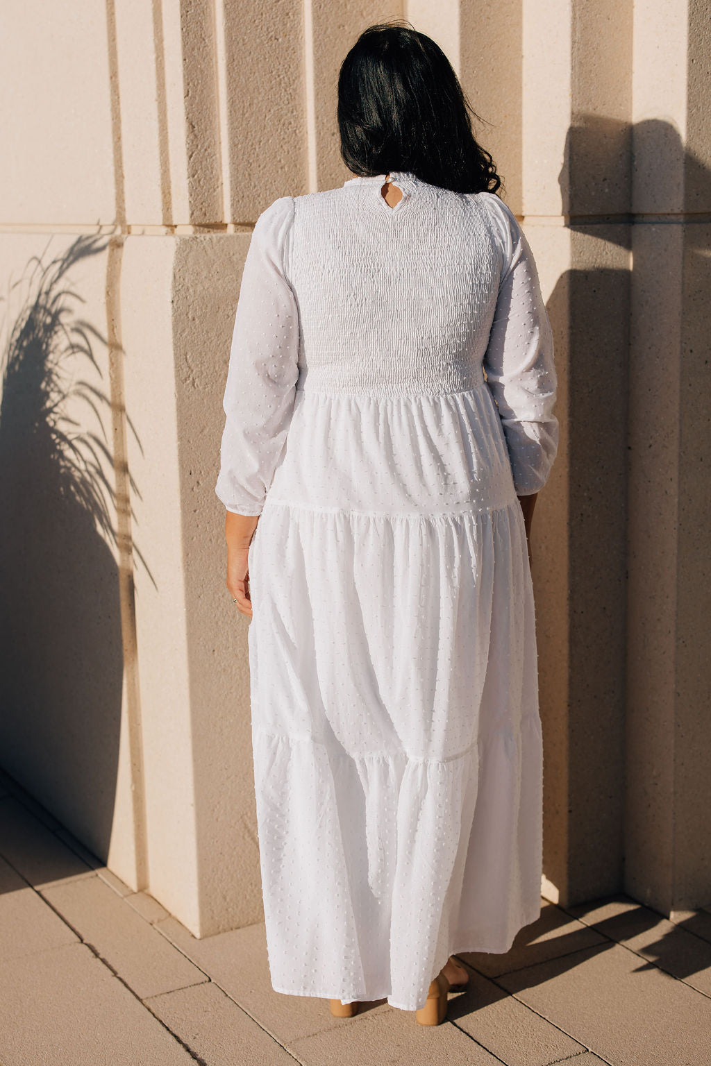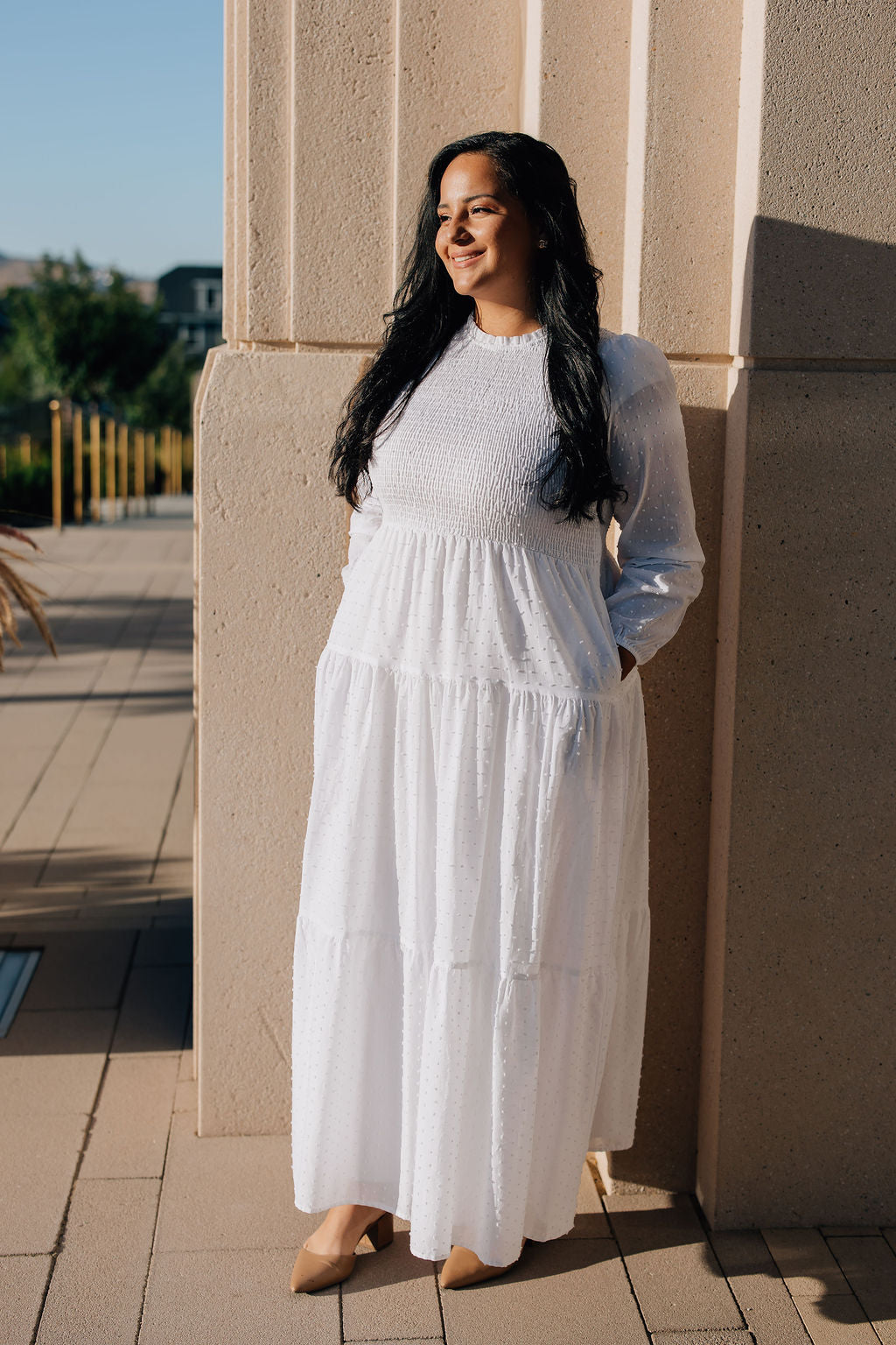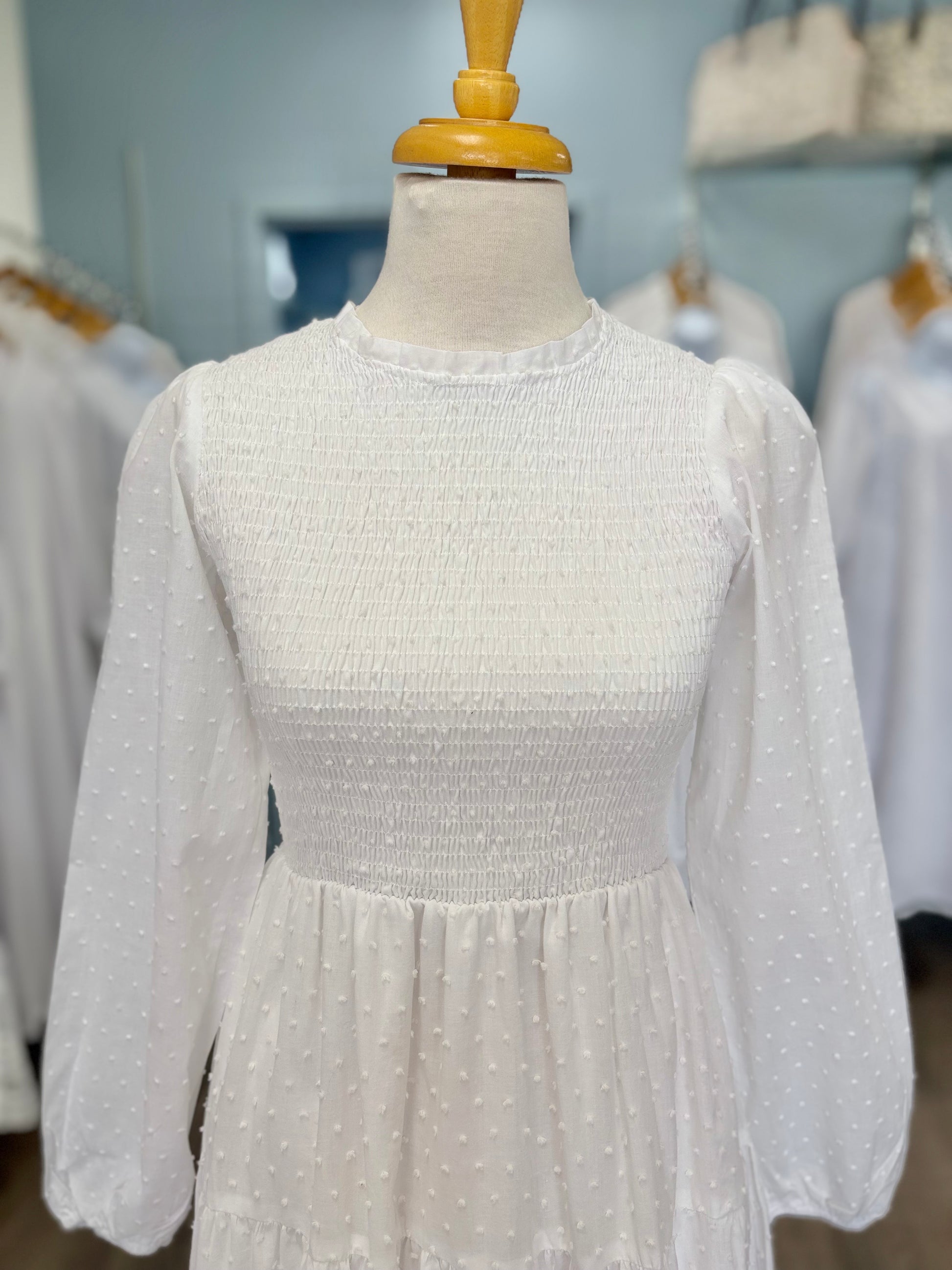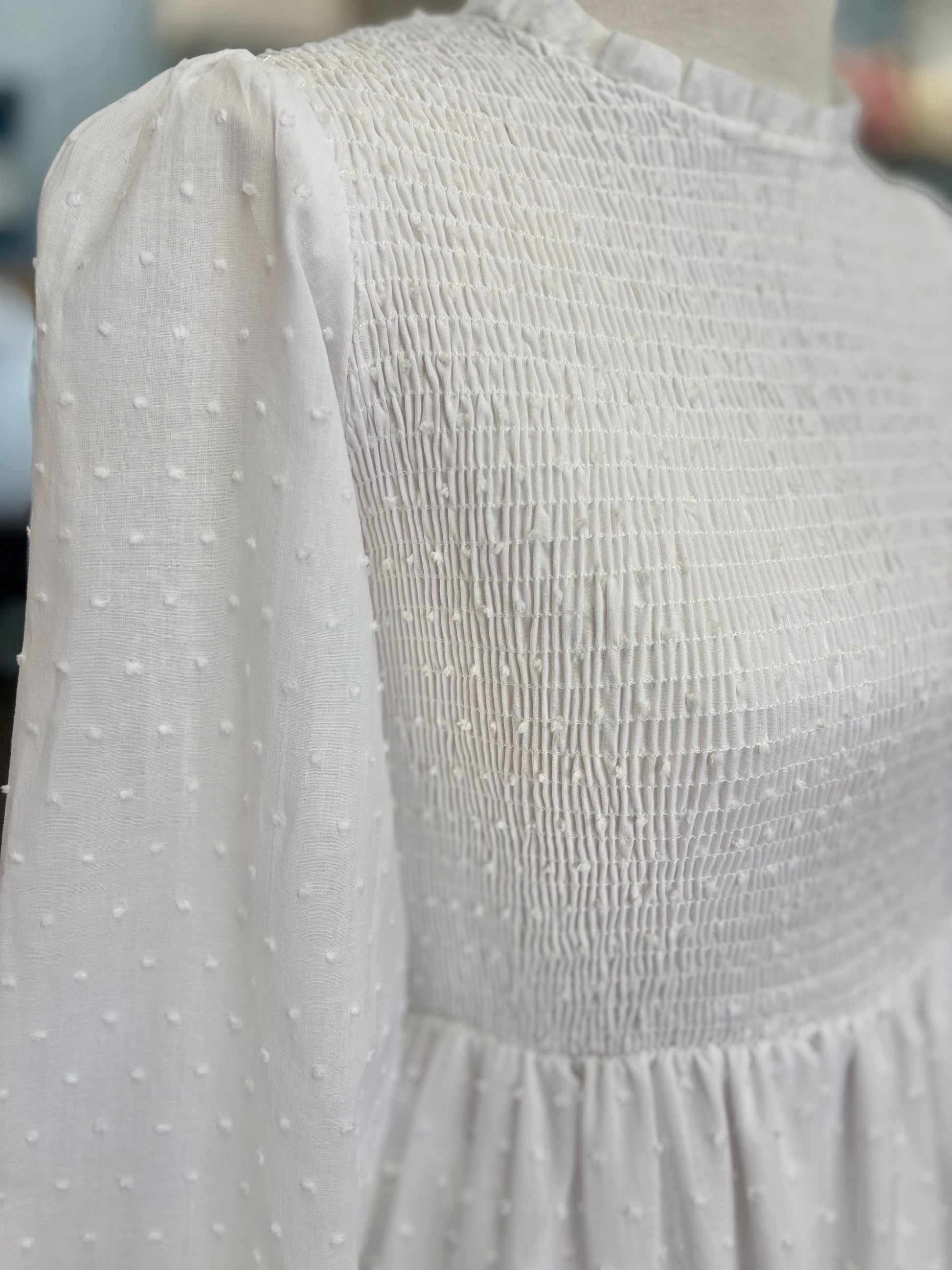 The Catherine dress is made from soft and breathable cotton. It has an all over Swiss dot pattern, a tiered skirt, bishop sleeves, and a smocked bodice. This dress has two side pockets and a button keyhole at the back for easy on and off. It's perfect for any wedding or Temple visit!