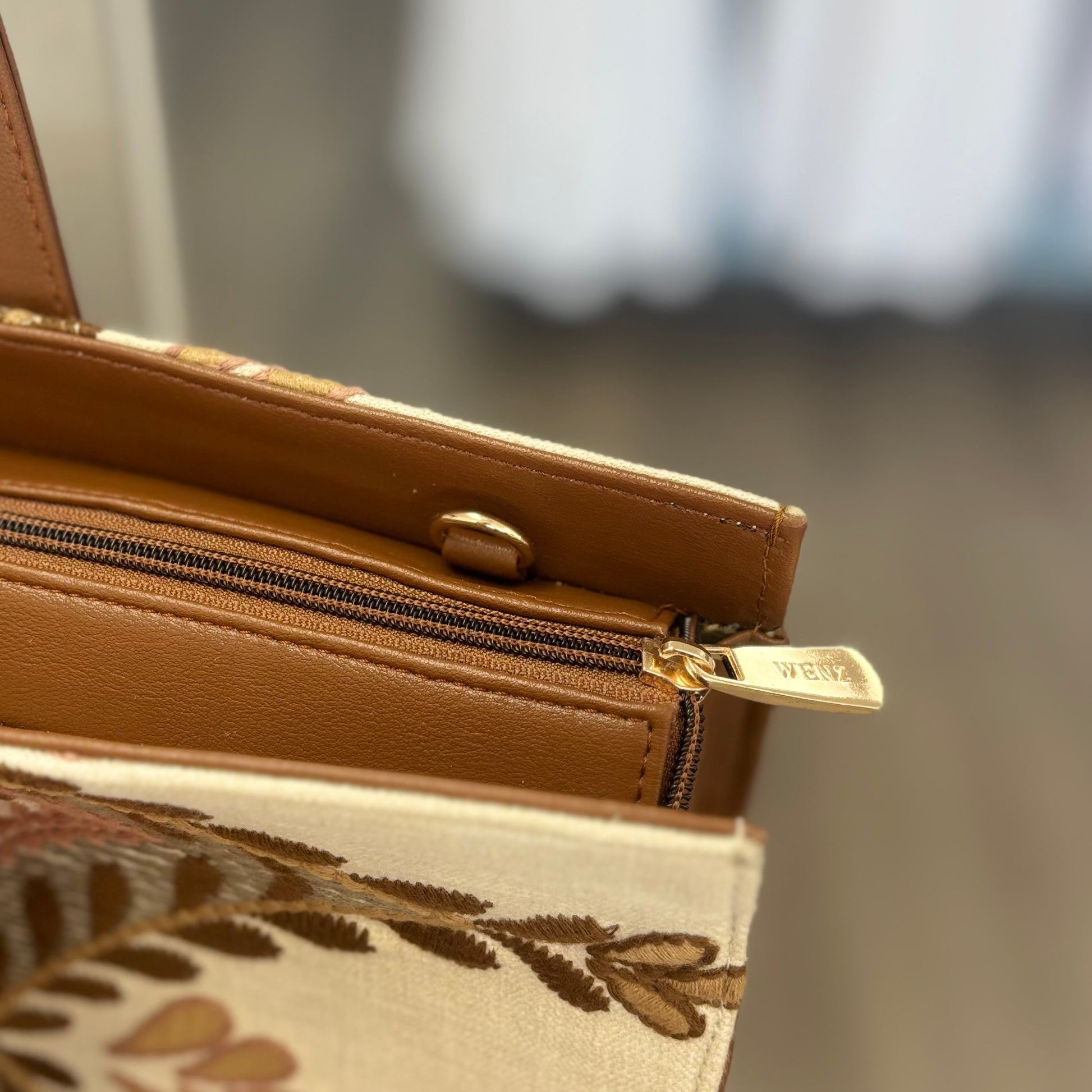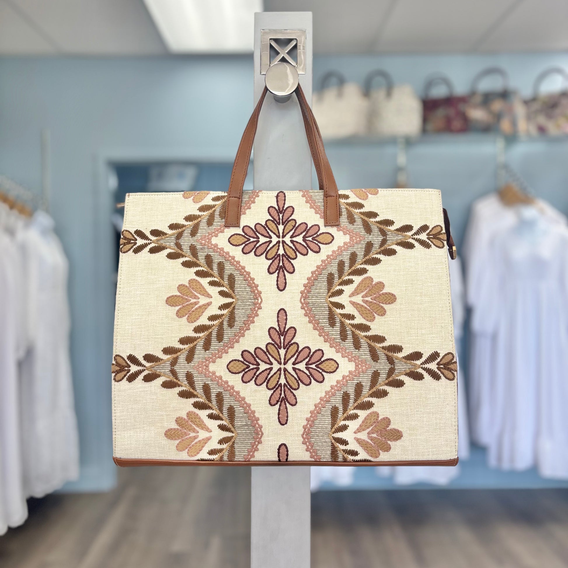 This bag is beautifully made with sturdy fabric, and butter soft faux leather. The cream background helps the pink and brown leaf pattern stand out beautifully. This bag has leather handles and features a wide zipper opening and two inside pockets for organizational needs.
