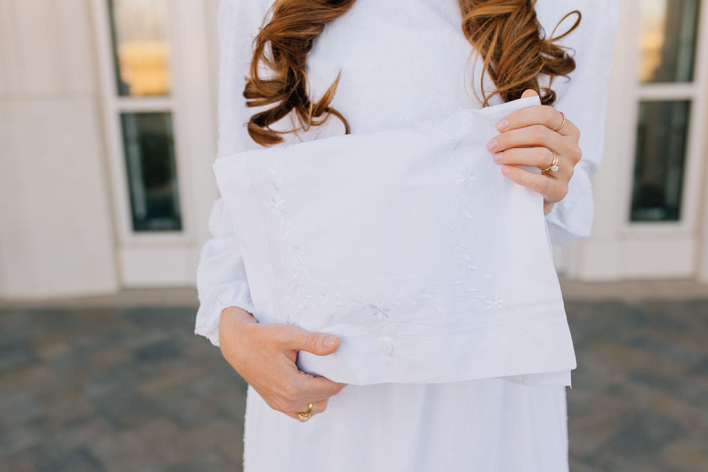 Heart Button Envelope er lavet af bomuld og har en kombination af sømsyninger og broderi på en firkantet flap foran. Der er en lomme indeni og en hjerteformet knap for at holde den lukket. Den måler cirka 11 x 14 tommer. Desværre er vi ikke længere i stand til at modtage særlige ordrer på templer, navne eller datoer. Vi kan også tage særlige telefonordrer, hvis du vil bestille dit lokale tempel eller et navn. Der er dog mindst 12 stykker, alle identiske. Importeret.