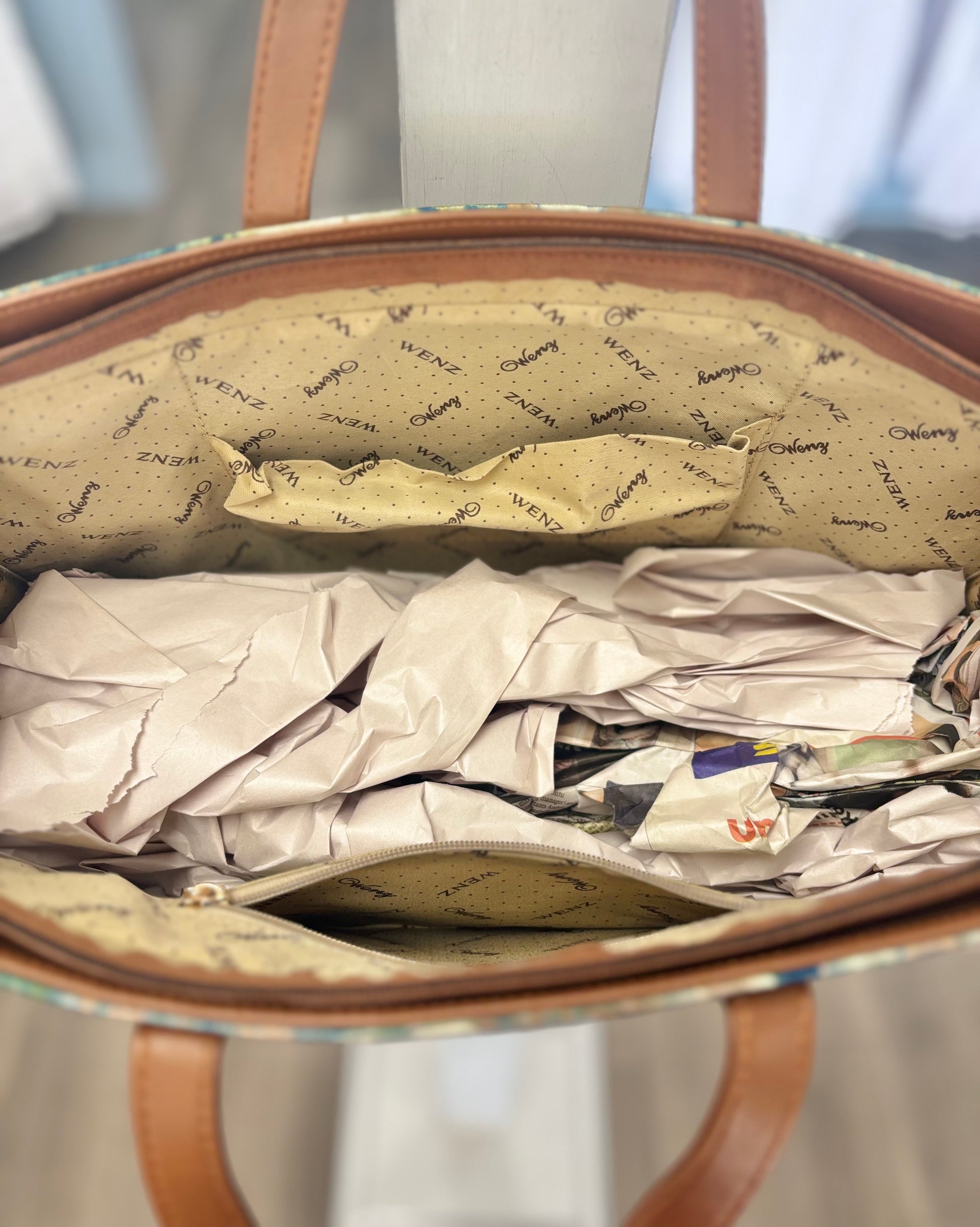This bag is beautifully made with luxurious velvet-like fabric, and butter soft faux leather. It has an abstract floral design with green and blue colors throughout. This bag has leather handles and features a wide opening and two inside pockets for organizational needs.