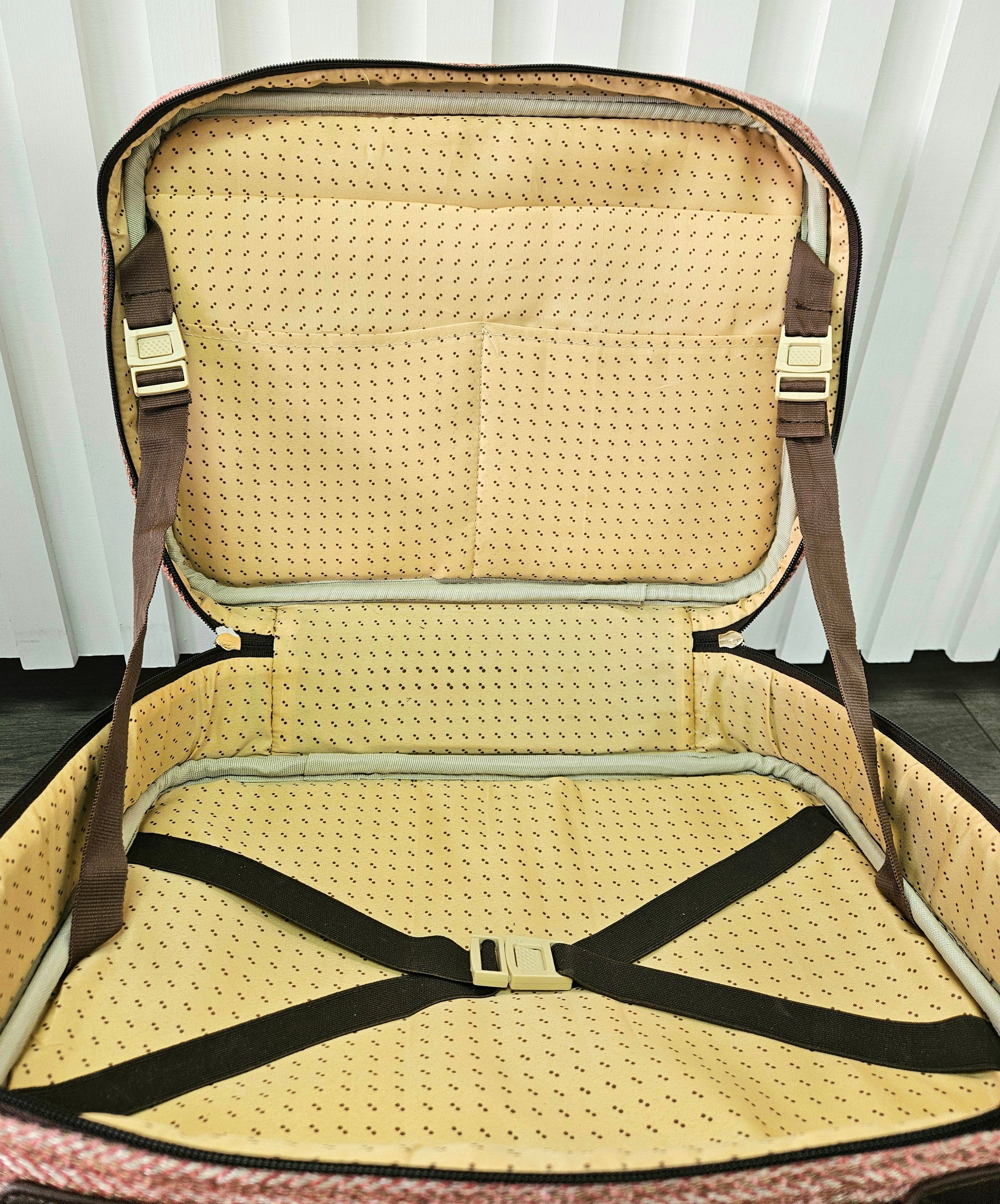 This suitcase style bag is the perfect option for Temple trips. This bag zips closed and has adjustable straps on the inside to control how much the bag opens up. It has two outer zipper pockets, three inside pockets, and elastic straps with a buckle to keep everything in place during travel. A classic houndstooth pattern covers the outside, and is complete with brown leather and gold accents. Big enough to fit shoes or slippers, a dress or pants and a shirt, an envelope, hankie, fan, and any other necessities you need, this bag is ideal for anyone!