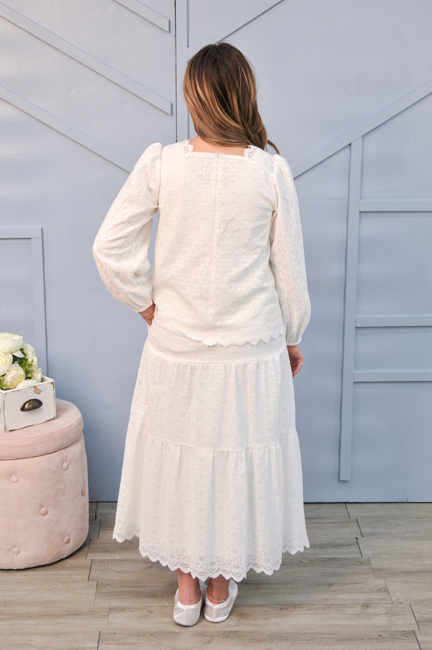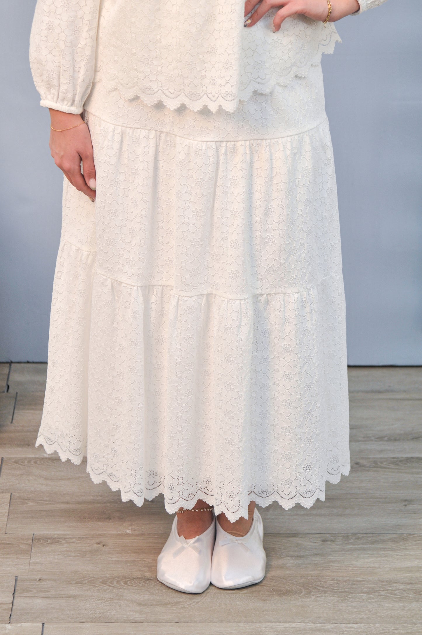 Our Georgia Lace skirt is made from a beautiful, elegant lace fabric, and features a graduated, three tiered style with a scalloped hemline. It has two side pockets and is fully lined. Perfect to wear to the temple, for family pictures, special occasions and more.