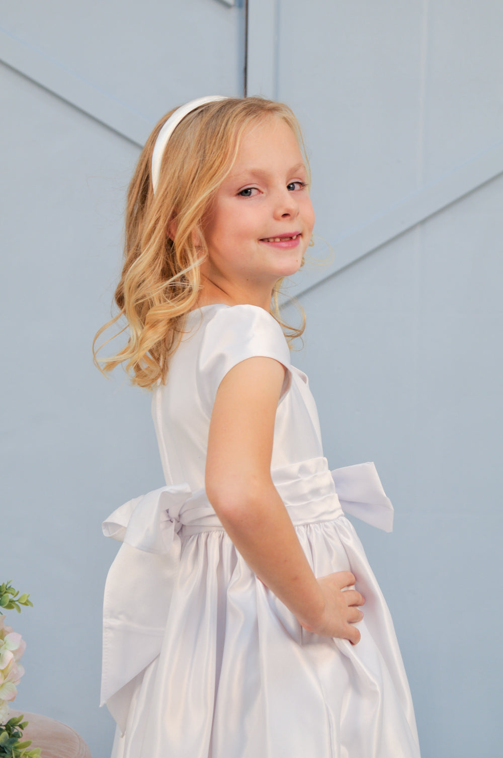 The Gretchen dress is simple but elegant. It is 100% Polyester fabric that is hand washable with a cross V neck bodice. This dress has a back sash and zipper. A beautiful option for your daughter's first communion, baptism, or flower girl occasion. Made in the USA.
