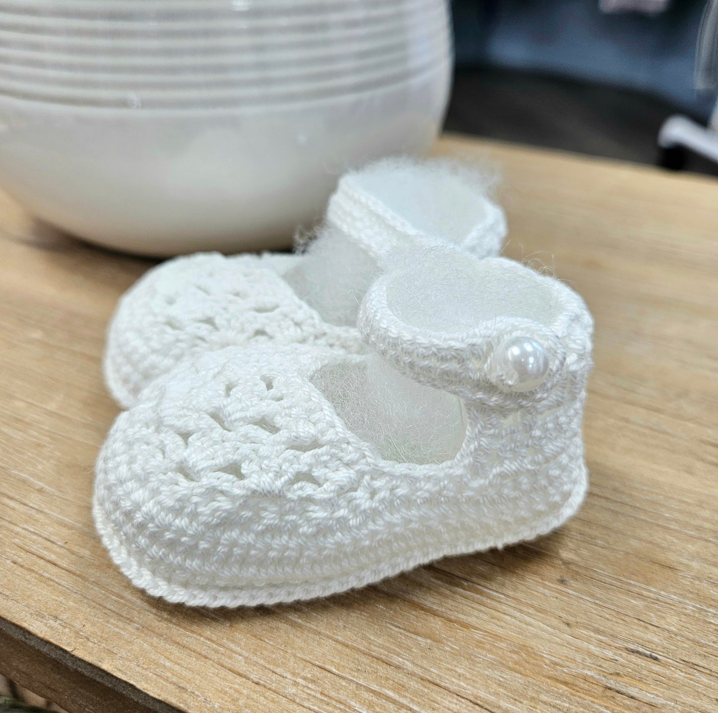 These little baby booties are made from soft, comfortable yarn. These booties have an ankle strap that fastens with a pearl button. These make a wonderful heirloom for baby blessings and christenings. Hand Crocheted in the Philippines. Imported.