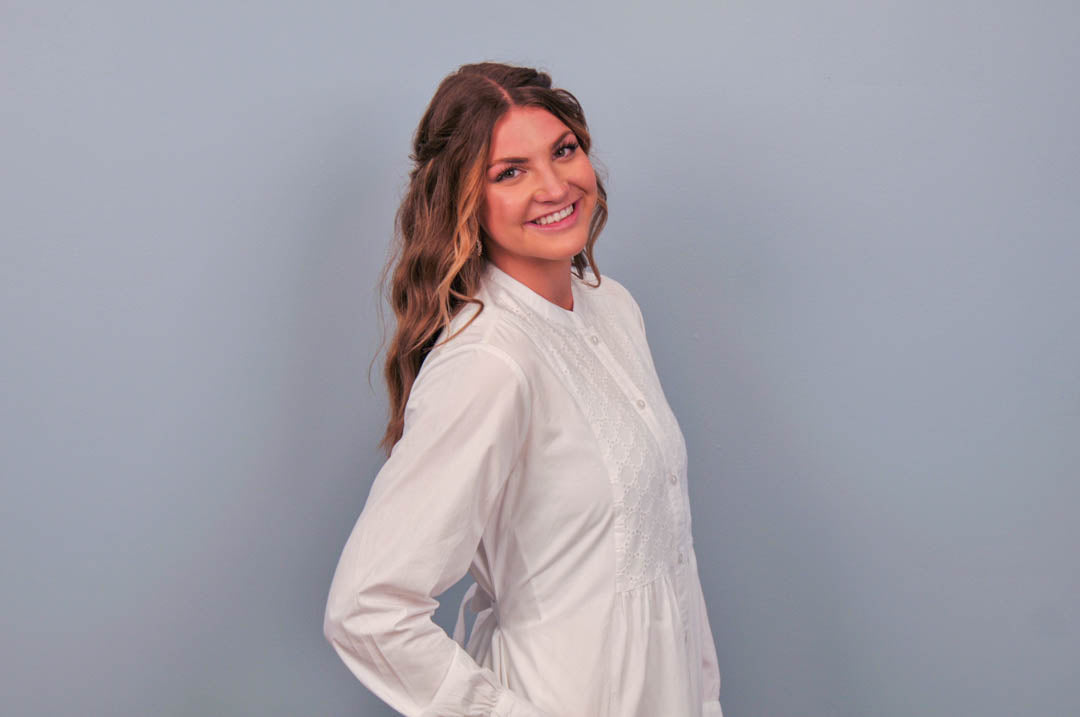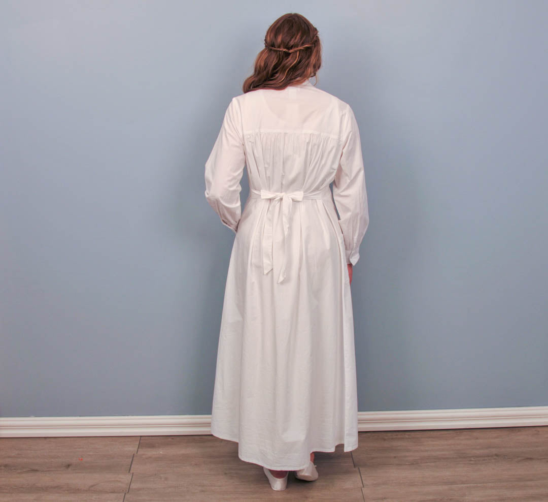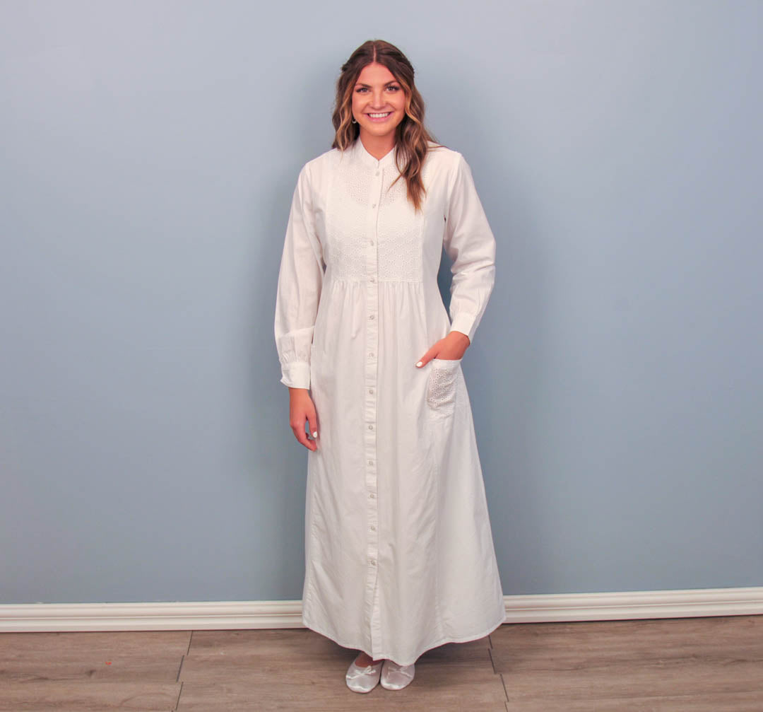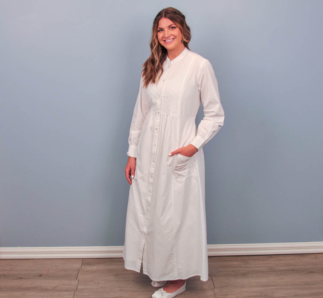This dress is made from 100% cotton with buttons down the front and a tie in the back at the waist. The style is made to be roomy and comfortable. The circle pattern on the bodice is subtle but elegant. This dress has a mandarin collar, button cuffs, and two embroidered front pockets.