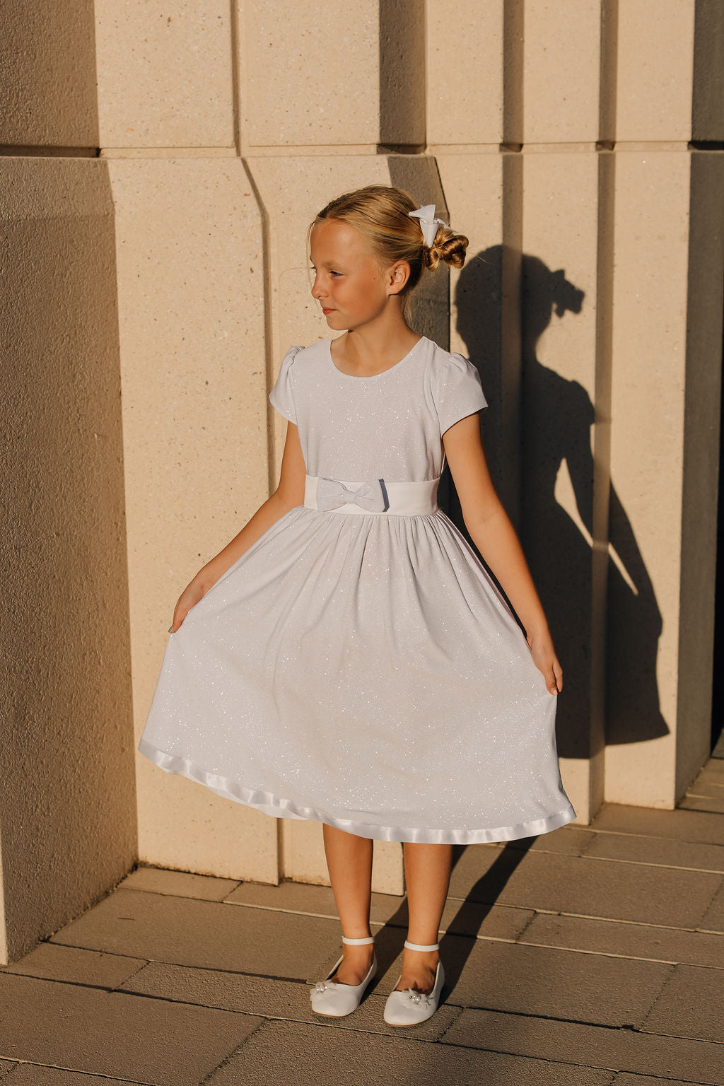 The Elena dress is a fun and unique option for baptisms or other special occasions! It's made from beautiful sparkly fabric, has a satin band around the waist, a sparkly bow at the front, and has a hem that is lined with soft ribbon. This dress has a tie waist and zipper at the back. Made in the U.S.A.
