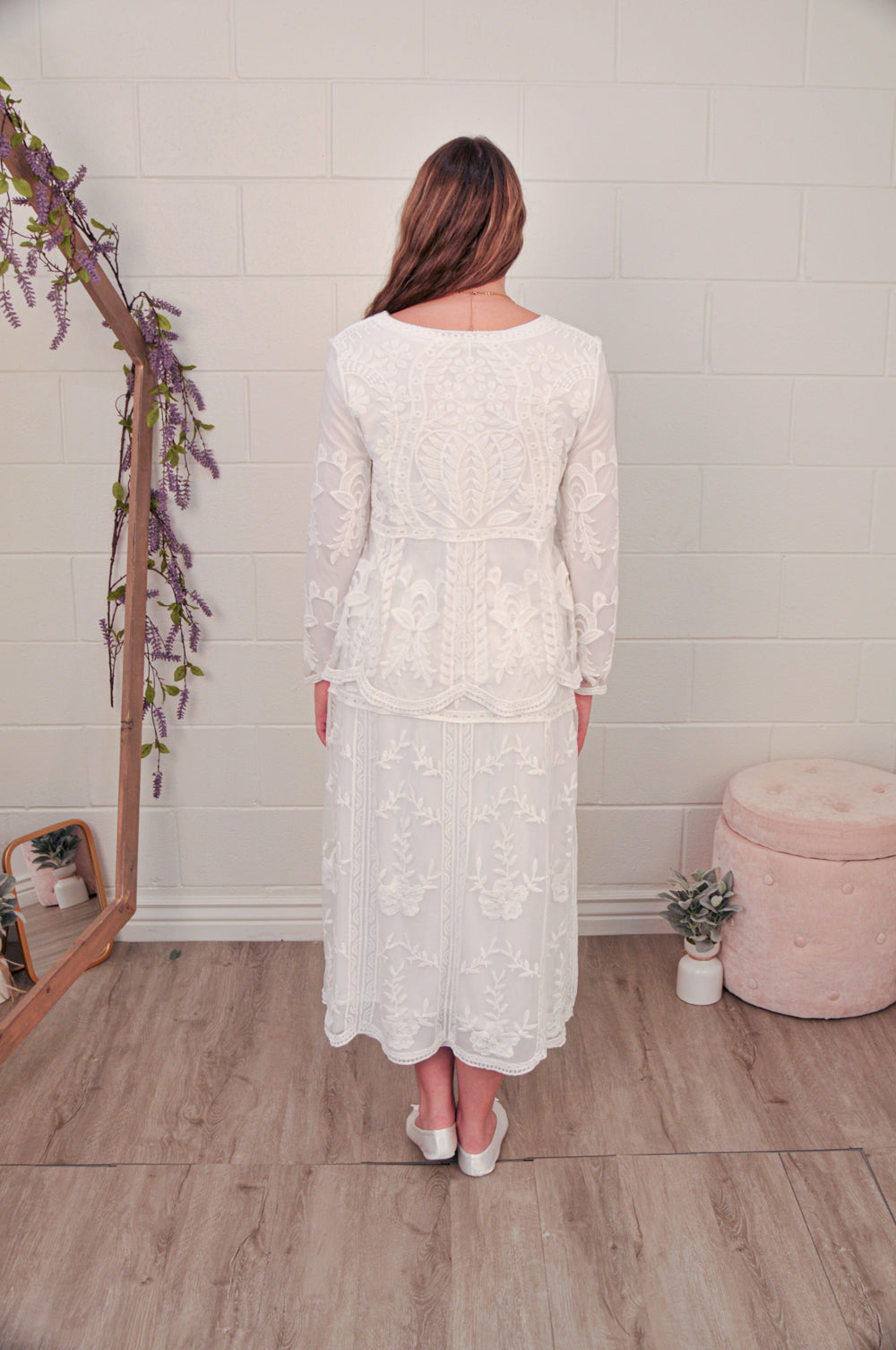 This all white lace top is beautiful and comfortable, and is perfect to wear in the temple. This top features an all over lace design with a heart on the front, a scalloped hem, and is made in a pull on style for ease of wear. This top is fully lined and can be worn as a set with our lace skirt (shown in pictures) or with a plain skirt. We recommend the plain polly skirt or the dew drop skirt.