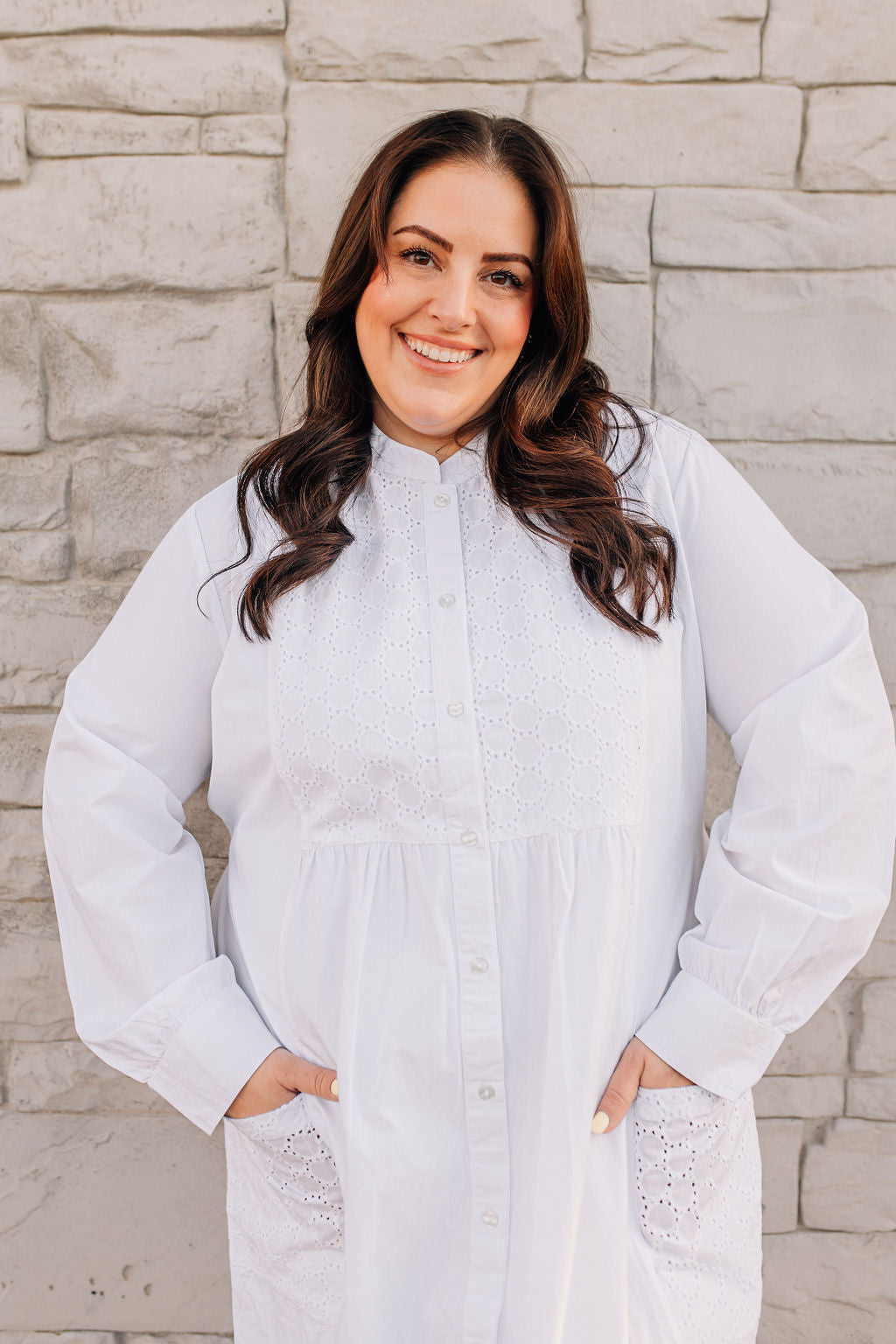 This dress is made from 100% cotton with buttons down the front and a tie in the back at the waist. The style is made to be roomy and comfortable. The circle pattern on the bodice is subtle but elegant. This dress has a mandarin collar, button cuffs, and two embroidered front pockets.