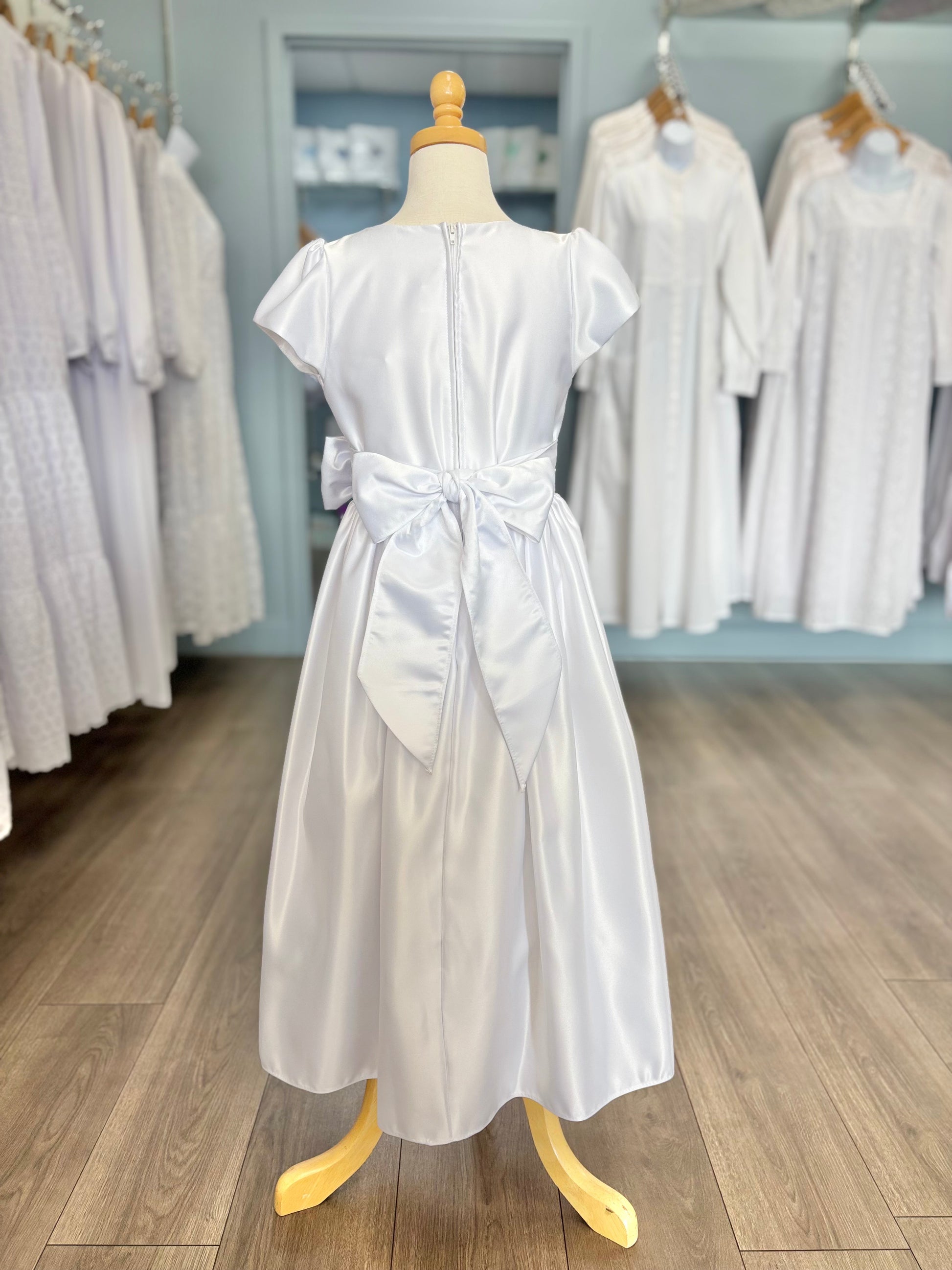 The Gretchen dress is simple but elegant. It is 100% Polyester fabric that is hand washable with a cross V neck bodice. This dress has a back sash and zipper. A beautiful option for your daughter's first communion, baptism, or flower girl occasion. Made in the USA.