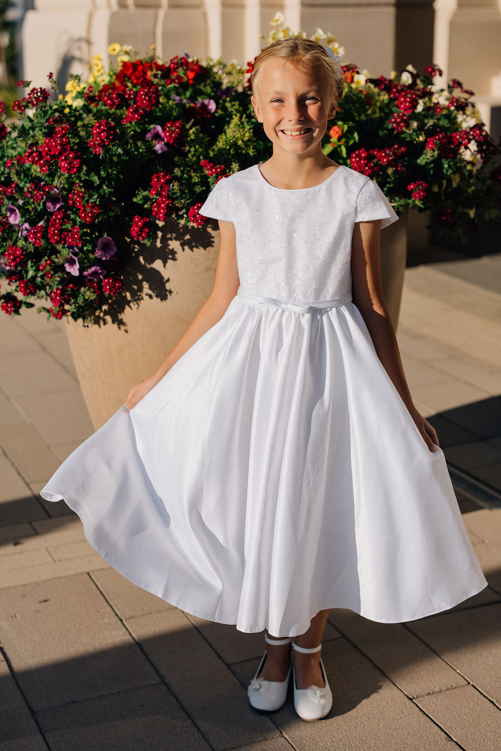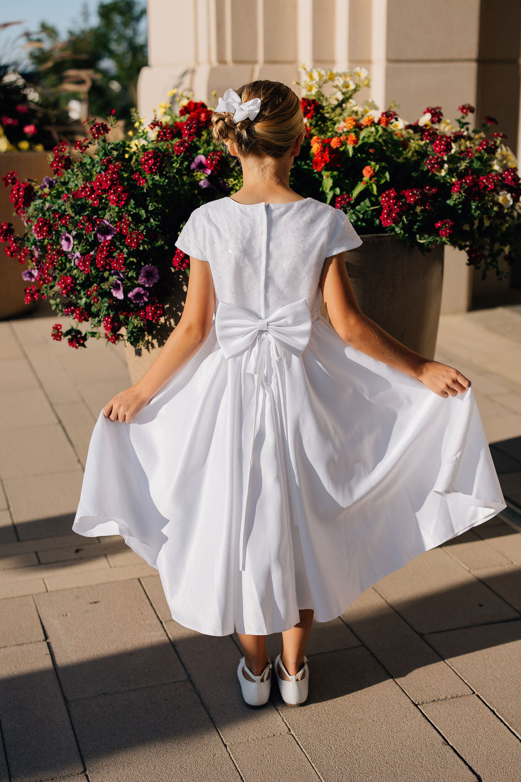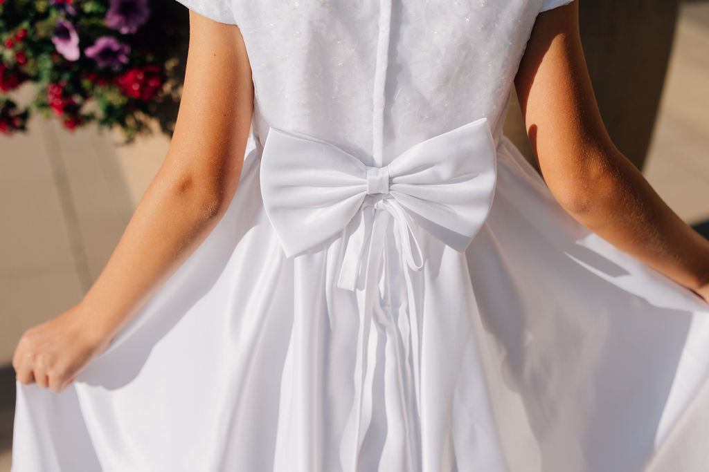 The Ivie dress is simple but beautiful. With a satin line skirt, sequin bodice, and decorative bow at the waist, this dress is perfect for a baptism, communion, or special event. This dress zips up the back, has a tie waist, and has a big decorative bow attached at the back!