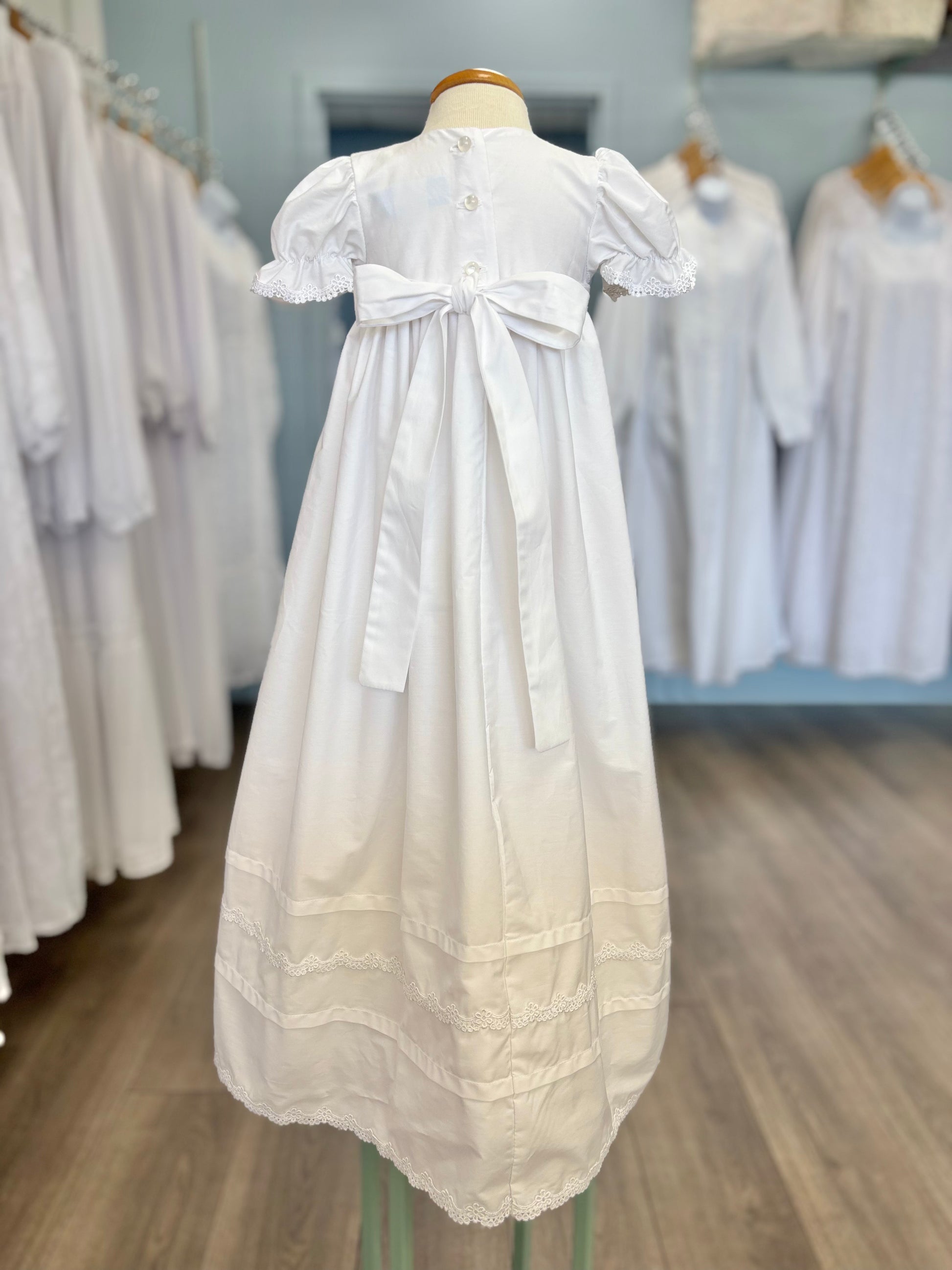 This baby dress is made of soft, comfortable cotton, and is a great option for summer. It has a simple, but elegant design. With a long skirt, cinched in puffed sleeves, and details at the waist and hem of the dress. This dress is fully lined and has buttons at the back and a tie waist. Comes with a matching bonnet. It is the perfect choice for baby blessings and christenings. Made in the USA.