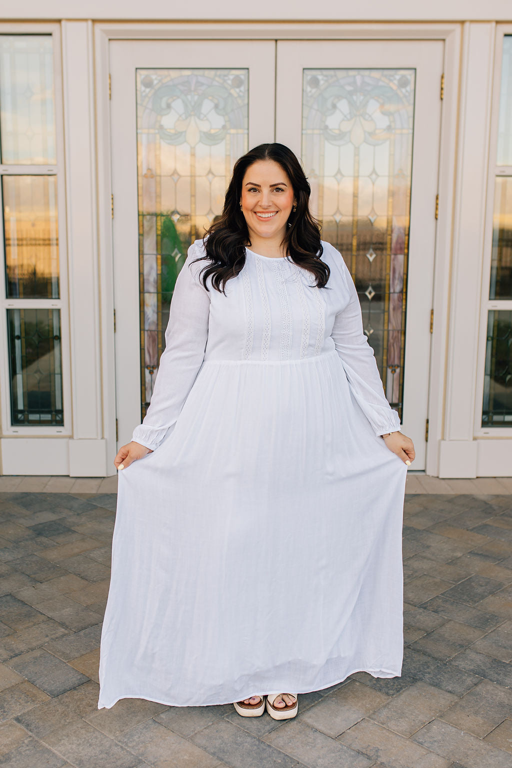 This dress is a great choice for an LDS temple dress. The rayon fabric is lightweight and soft. This dress features bishop sleeves, lace trim work on the bodice and two pockets. This pull on style is easy with a keyhole button in the back and elastic in the back of the waistline for a comfortable fit. Fully lined.